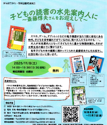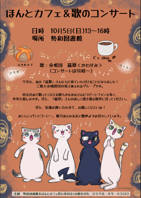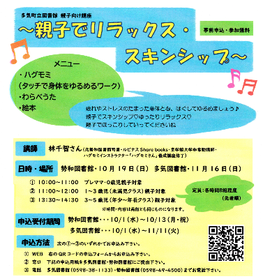 新着情報%Y年%m月%d日 新着情報 【勢和】10月5日(日曜日)ほんとカフェ&歌のコンサート 【終了しました】 【勢和】10月19日(日曜日)~親子でリラックス・スキンシップ~ 【多気・勢和】11月8日(土曜日)子どもの読書の水先案内人に~斎藤惇夫さんをお迎えして~ 【多気】11月16日(日曜日)~親子でリラックス・スキンシップ~