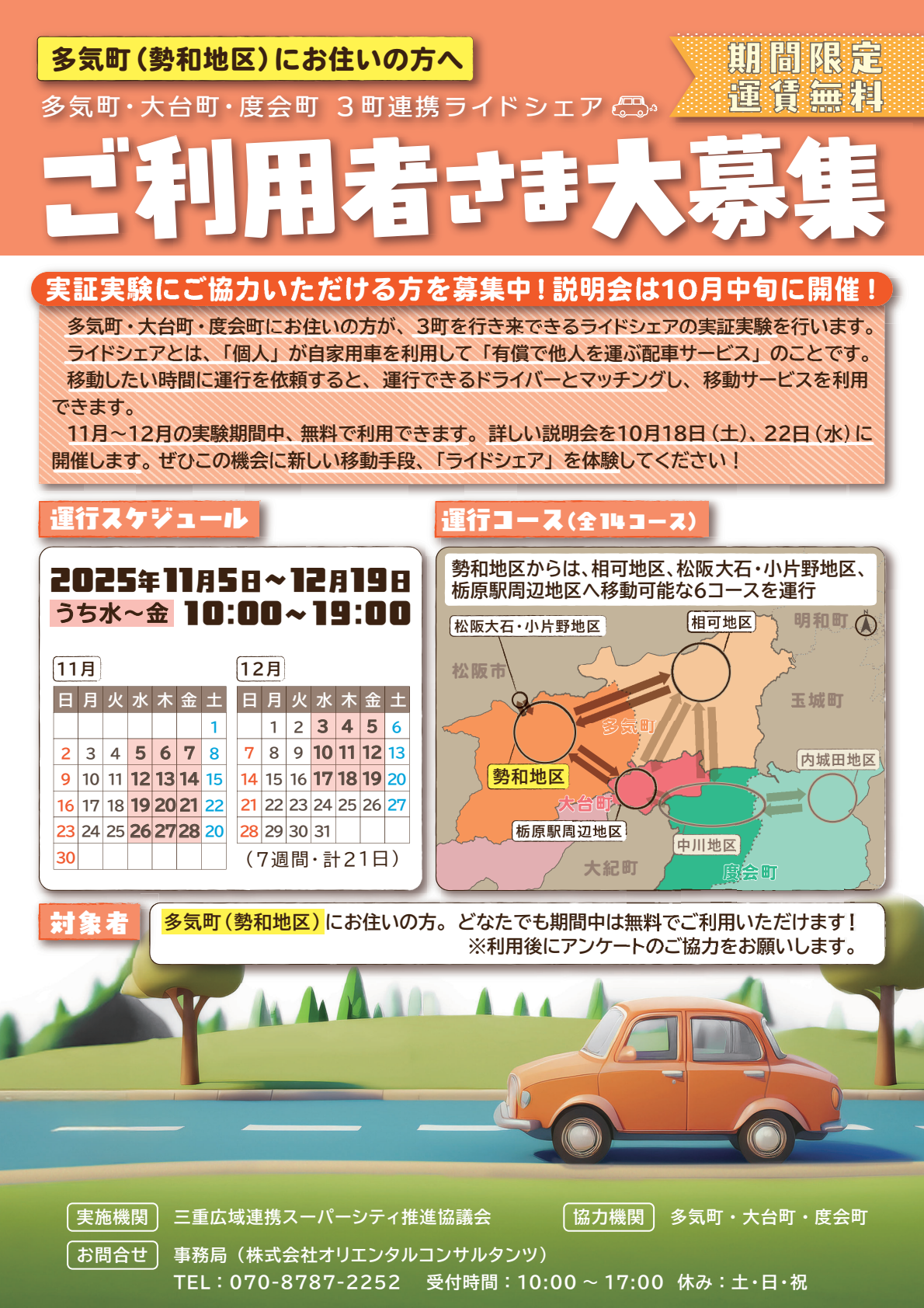 多気町・大台町・度会町にお住いの方が、3町を行き来できるライドシェアの実証実験を行います。